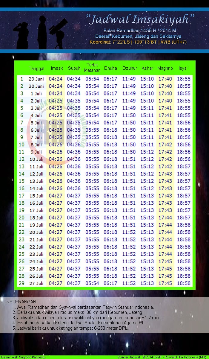Pada postingan kali ini saya akan memberikan jadwal imsakiyah ramadhan 1435 H atau tahun 2014 M. Walaupun awal puasa masih belum ditentukan oleh Pemerintah, tetapi kita saat ini sudah bisa menentukan jadwal imsakiyah, ini memakai metode hisab rukyat (Ilmu Falakh). Ilmu ini memang bisa digunakan untuk menentukan waktu/jadwal puasa, shalat, dll.